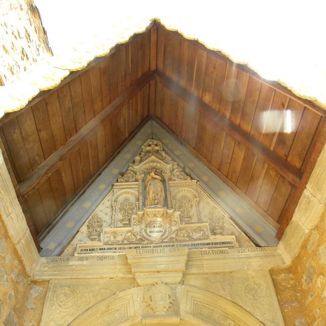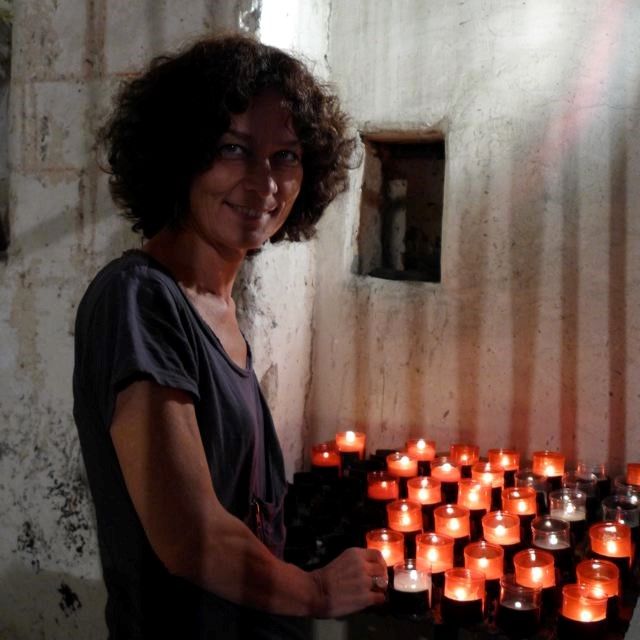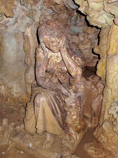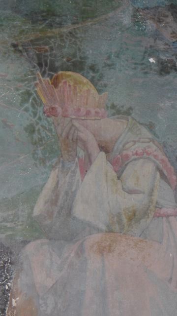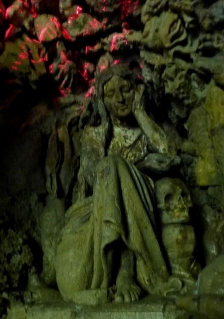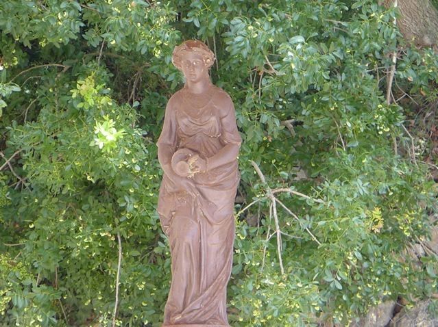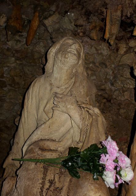 Favourite places are of course the Cave of Mary Magdalene, frequented by our dog Ruah, the cave with this strange, colourful picture, the Source of the Mother Goddess in Campagne-les-Bains and the church of Rennes-le-Chateau. Next comes Alet-les-Bains with its church housing a curious wall painting, its abbey and the statue of Diana or Athena and the house of the grandparents of Nostradamus on the town square. At the entrance to the ‘Galerie des Anges’ we find a fierce lion of Judah and the statue of Mary Magdalene? A little further north are the sources with that special, free water from Alet. And high up the hill east of Alet is the little church of St Salvayre, with a beautiful view of the two sacred mountains, the Pech Cardou and the Pech Bugarach. And two new items, the wall with holes in it, as described so colourful by my friend Val Wineyard in her new book Alet les Bains. And this lady of Alet located near the public springs. And last but not least the “Angels Galerie” of Lorrie and Eugene. Always a great and fitting end to any full day program.