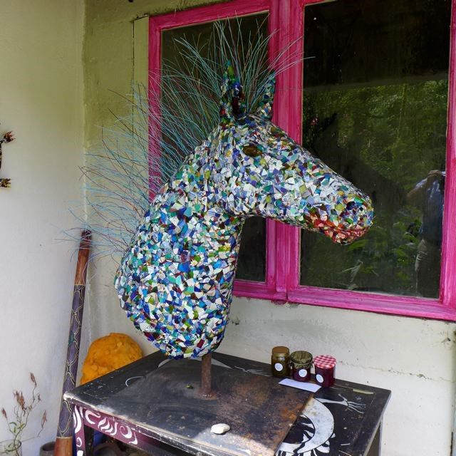 Or this crazy restaurant in the valley of the river Rebenty. Run by a lovely English woman. The restaurant is called ‘Seaview.’ A great name for a restaurant surrounded by mountains and far from the sea. But the food is of excellent. And the place is a wonder of artistic objects, like the four different heads of horses, all made of little pieces of glass and stone. To make one head took 4 months the woman told me. Remember the name: Seaview in Belfort de Rebenty. And it is wonderful walking in this area. On ancient Roman roads. See pic’s 096 – 102.