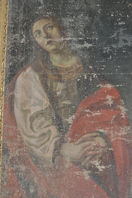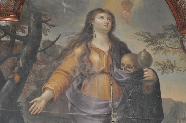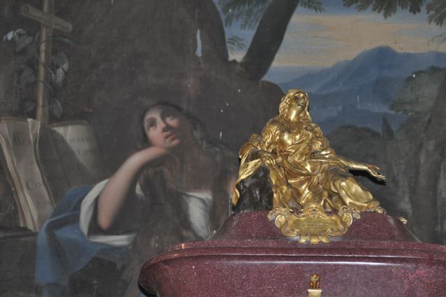 Then we went to the Basilica Marie-Madeleine in St-Maximin-la-Ste-Baume. The first and most important pilgrim site of Mary Magdalene. Look inside {PIC 06}. And outside {PIC 07}. It is incredible how many beautiful paintings, statues and panels of Mary Magdalene can be found in this basilica. And in what sorry state most of them are. Have a look at {PIC 08 – PIC 18}. Look also at the famous ‘noli me tangere’ scene {PIC 19} where the correct translation is not ‘do not touch me,’ but ‘do not cling to me.’ And the picture where Jesus is hanging on the cross and angels are collecting his blood {PIC 20}. A sure sign, for those who can see, that Jesus was still alive, for dead people do not bleed. In the town hall next to the basilica was an exposition about the building of the basilica. It was started in 1279 after Louis IX, king of France and Charles II king of Naples {PIC 21} and count of the Provence, had discovered the remains of Mary Magdalene in the chapel. With this lovely portrait of Mary Magdalene {PIC 22}.