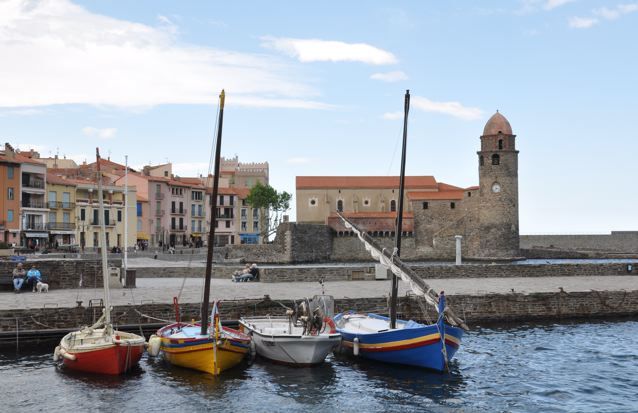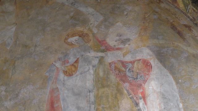 A little further, up the mountain is the village of Goulier. With this enigmatic portrait of Mary Magdalene, standing at the foot of the cross and looking up, through her fingers, at her beloved Jesus {PIC 51}. It was a beautiful day. The sun was still shining, but clouds were rolling in over the Pyrenees. A wonderful setting for the Stone of Sem {PIC 52}. One afternoon we went to Collioure. Mara had to see the sea, Mare Mediterranea {PIC 53}. In the church near the harbour entrance is chapel, first on the right, with a magic painting of Mary Magdalene, sitting in a cave {PIC 54}. Alet-les-Bains can’t be missed. Especially not the abbey. Some say the most beautiful ruin in France {PIC 55}. And what about the mysterious wall painting in the church. A man with an eastern face, a shield with a Chinese dragon, a scythe in one hand and the other on Mary Magdalene’s shoulder. What could be the meaning of that? {PIC 56}.