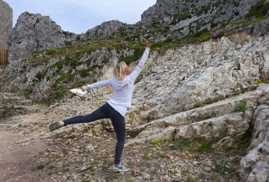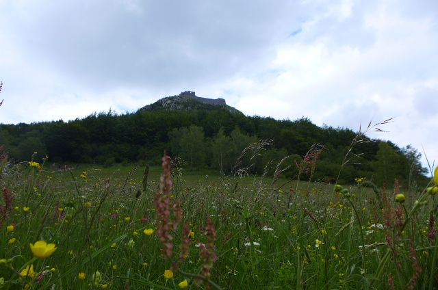 Thursday June 5: Driving past La Valdieu, the Pas de La Roque to Rennes-le-Bains. Then on a steep road up to Montferrand. A 30-minute drive. Parking the car and climbing the Pech Cardou, the sacred female Mountain. Having lunch at the magic spot where 5 roads come together. A perfect pick-nick place. After lunch climbing the final part to the top of the mountain. The view is magnificent. There is a stone circle at the top and the whole crest of the mountain is covered in flowers. It is magic. We stay for quite a while, enjoying the sun, the view and the flowers. Then descending the mountain and going back, just for a while, to the trembling rocks, entering the area from the other side. Such a special place. Then back to Les Labadous, a 15-minute drive. See {PIC’s 57– 67}.