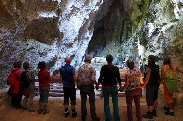Friday June 6: Going east, to the Initiation caves of the Cathars in Ussat-les-Bains. A 70-minute drive. Having lunch at the church of ND de Celles. Looking at the famous White Madonna in the church that has been renovated in a beautiful way. Then going to the Cave of Bethlehem. Parking the car and walking up will be a 30-minute hike. If the cave is closed we can go to the Hermit Cave or to the Eglise Cave. But the path is open. On the little plateau just in front of the Cave of Bethlehem we all change in white clothes. It is a wonderful sight. Everyone dressed in white. So special. We are having an extended ceremony in the cave, conducted by Thomas and Tania. Very, very impressive. Driving back to Les Labadous will take about 75 minutes. See {PIC’s 67– 71}.