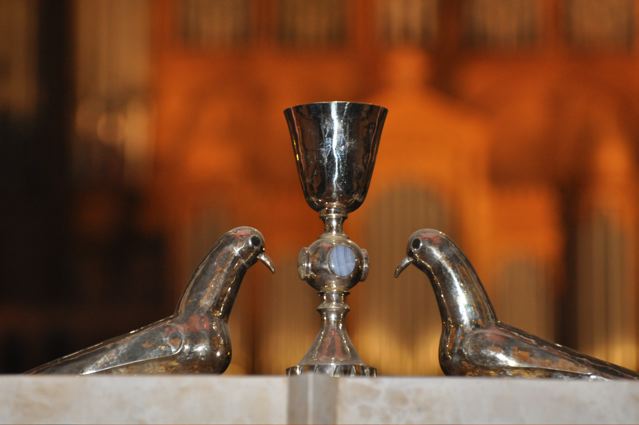 Nicolya stood a long time in front of the cave {PIC 05} and {PIC 06}. She could feel the energy. We then walked to the basilica, here seen from the side of the river {PIC 07}. A beautiful building. With a very rich interior. Huge chapels circled the inside perimeter, painting the life of Christ. There was gold everywhere. I was happy to find at least one chapel, portraying the crucifixion, where Mary Magdalene could be seen {PIC 08}. And on the altar stood this lovely goblet, with two doves. The Holy Grail? {PIC 09}.
