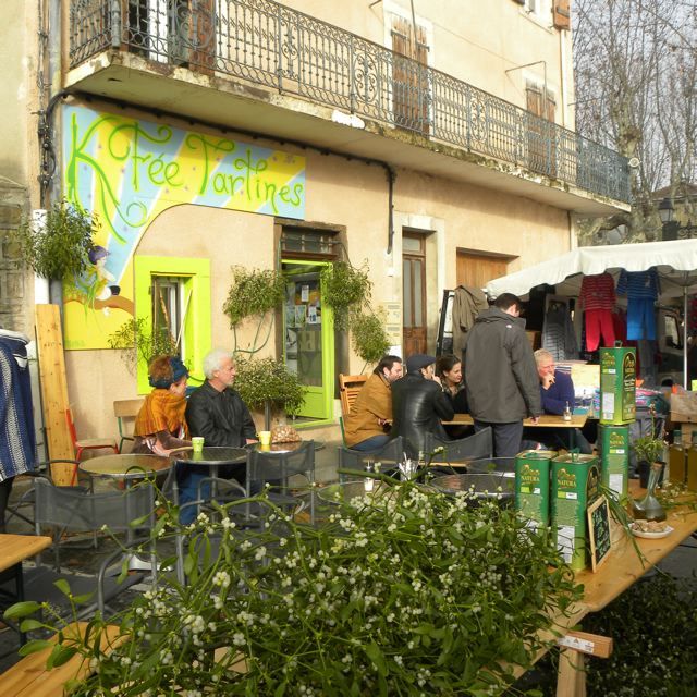 A beautiful day. With the sun shining brightly and temperatures up to 14 degrees Celsius. Look how lovely Les Labadous is basking in the early morning sunlight {PIC 40}. And Joke enjoying the weather {PIC 42}. Sunday is the day of the market in Esperaza. The place to meet with friends, to exchange news, to buy all kinds of home made products and have a cup of coffee. Or a glass of pastis.