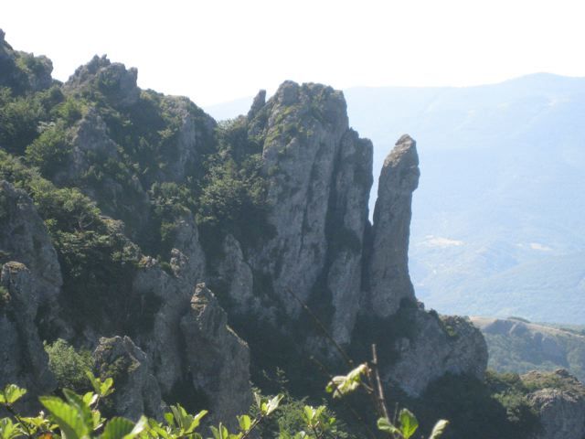 The mountain has many faces. The Pic Grosse sometimes looks like a bear. To others it is a sitting Buddha. See {PIC 05}. And very clearly a huge eagle can be seen ready to spread its wings and fly down to the village. See {PIC 06}. Many facescan be seen in the various rock formations. See {PIC 07}. There is even a beautiful phallus, complete with impressive balls. See {PIC 08}.