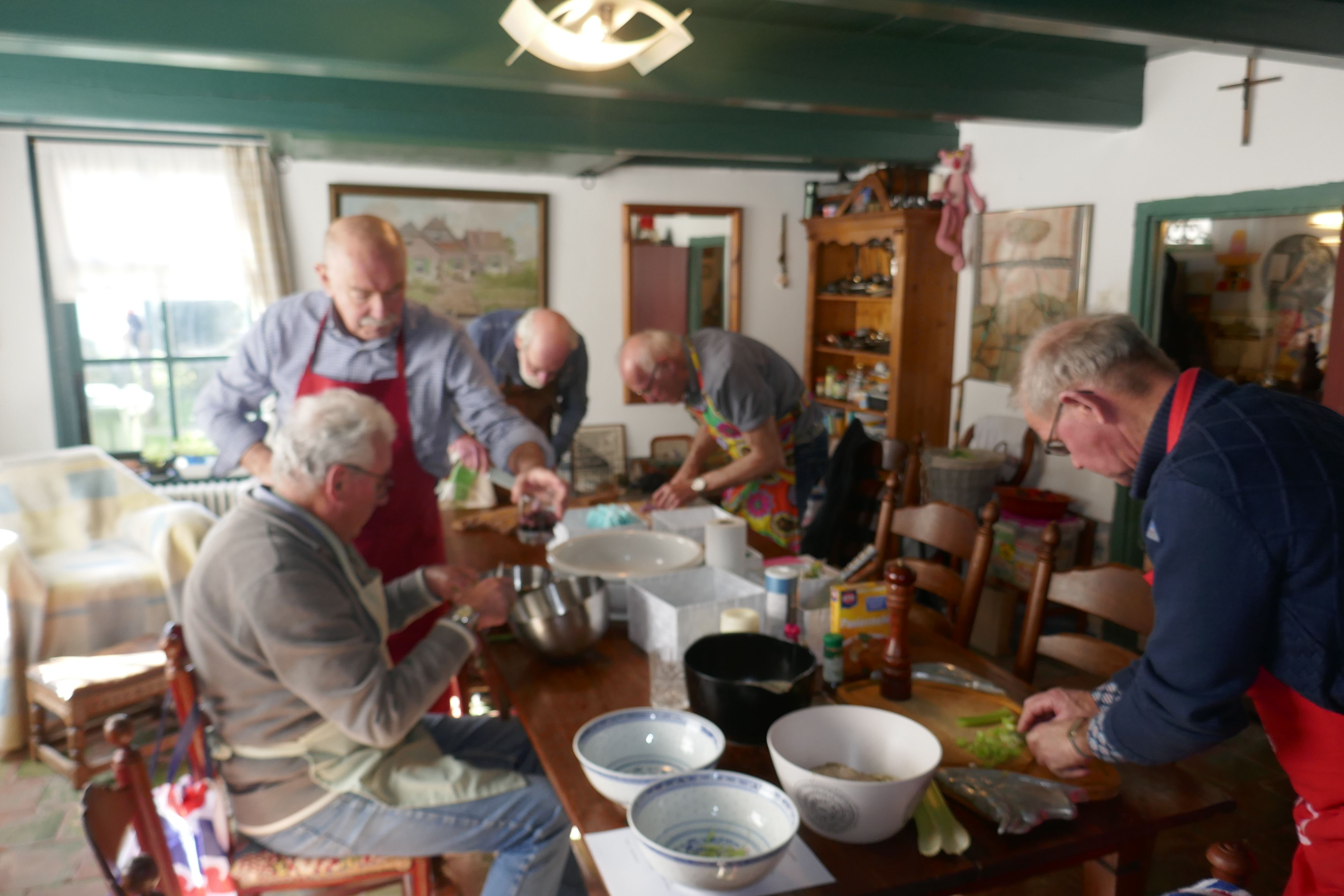 Niet beter of slechter dan vrouwen, maar anders. En zeker dit soort mannen, de permanent of tijdelijk alleenstaande mannen, want die koken voor hun plezier. Koken wordt hun nieuwe hobby. Heerlijk, zo’n hele dag even rustig rondhangen in je eigen huis. En dat geldt natuurlijk ook voor mannen met een partner. Al moet die deze zaterdag wel de deur uit. Kan ze mooi even met haar vriendinnen de nieuwe hobby van haar man bespreken. Vandaag is de keuken van hem, en hem alleen, misschien samen met één of twee van zijn kinderen. Dat is altijd leuk. Geef ze wat worteltjes, wat stukjes bloemkool, wat fruit en een paar plakjes worst, dan zijn ze ook onder de pannen. En praat met ze. Dan leren ze hun vader ook eens op een andere manier kennen. Maar geen vrouw er bij. Want als Margriet elk half uur, uit pure belangstelling, even haar hoofd om de hoek van de deur steekt en vraagt: “Gaat het goed, Hans?”, dan is de lol er snel van af.